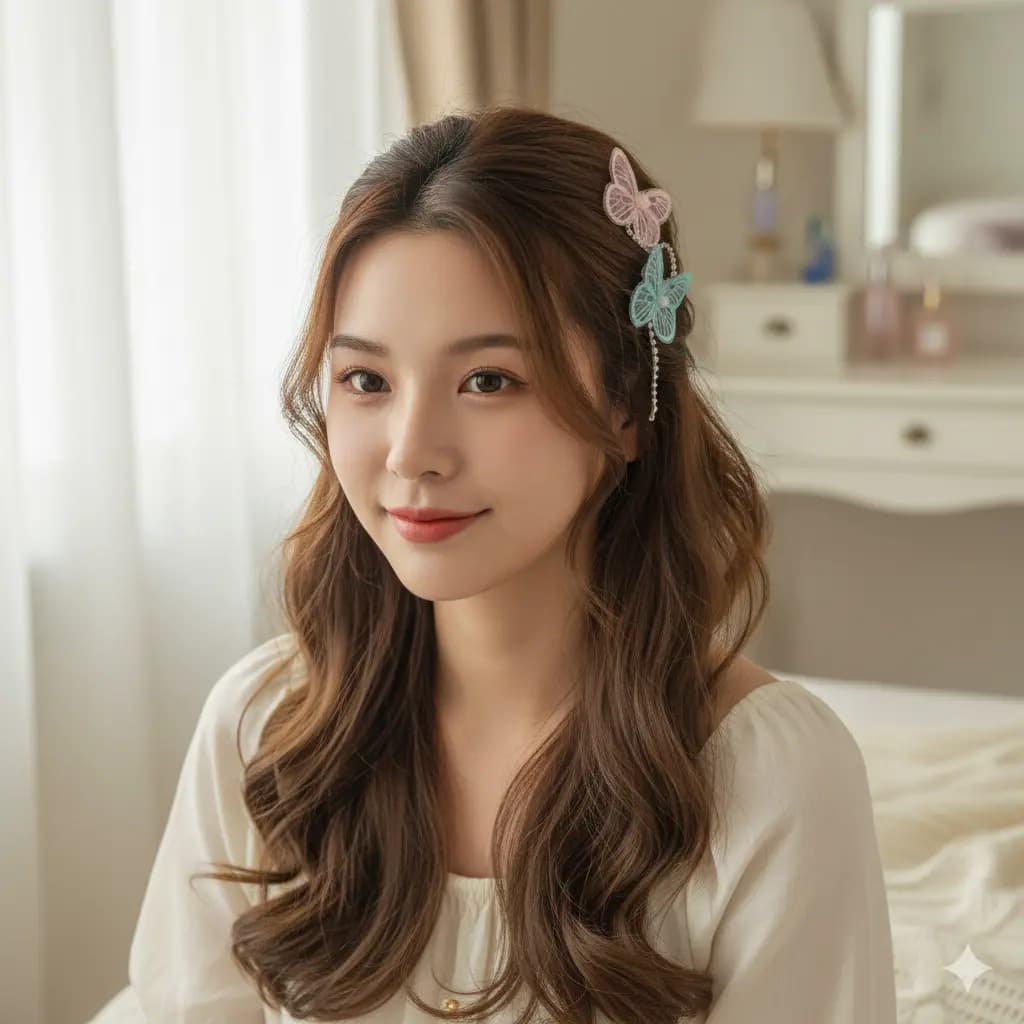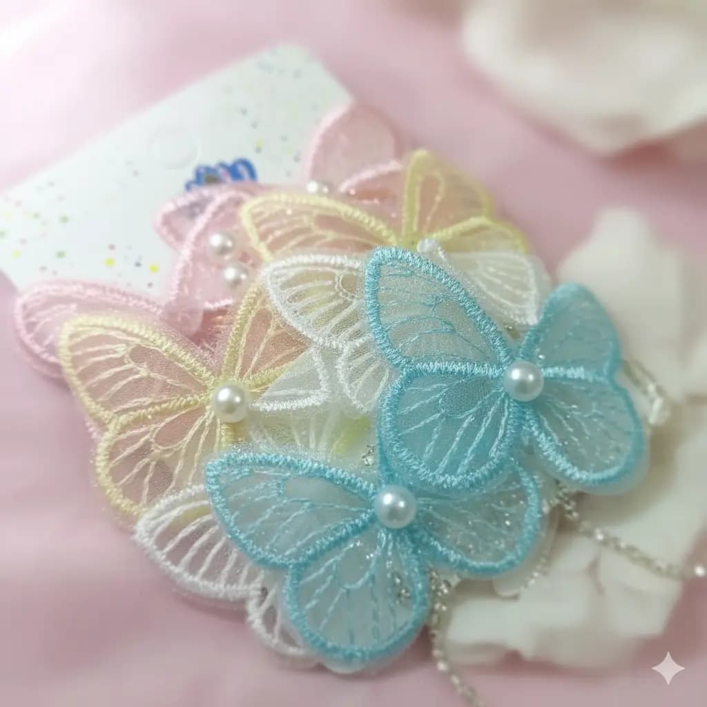 Elegant butterfly lace hair clip featuring a delicate dangling chain detail. This Korean-style hair pin set adds a dreamy, feminine touch to any hairstyle.