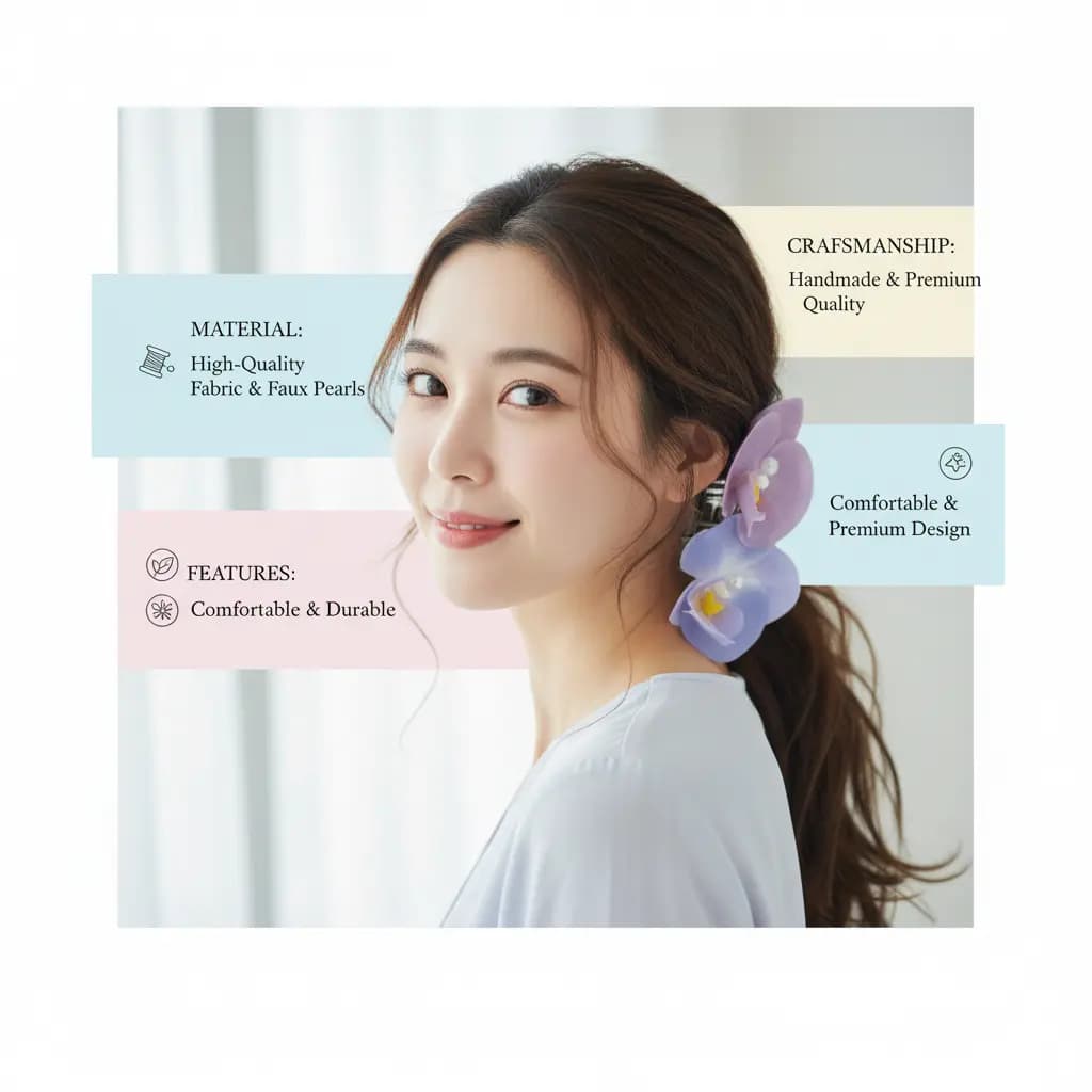 A soft pastel orchid flower hair clip embellished with a delicate pearl accent. This romantic clip adds an instant floral charm to updos, ponytails, and braids.